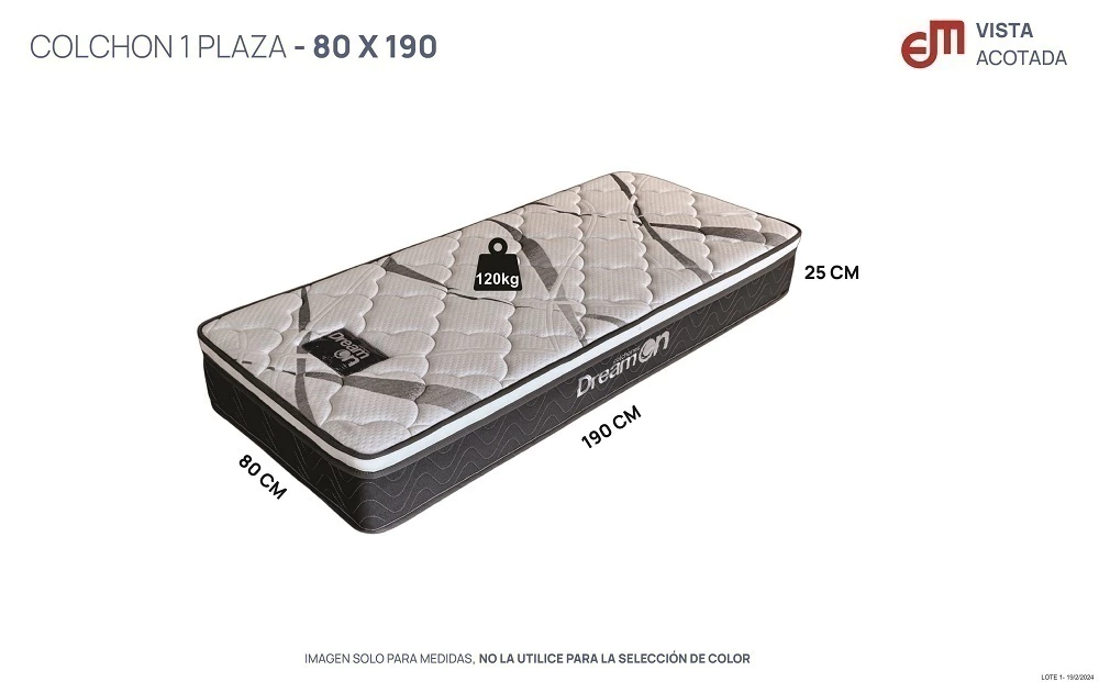 Medidas: 80cm ancho x 190cm largo x 25cm (+/- 1cm) alto. Peso: 18kg.