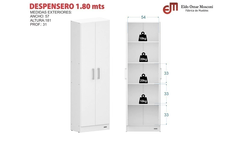 Despensero organizador multiuso para cocina o lavadero. Posee 2 Puertas con bisagras metálicas. Manijas plásticas. Tiene 5 estantes de los cuales 2 son regulables en altura. Fabricado en melamina de 15mm. Garantía de fábrica: 6 meses.